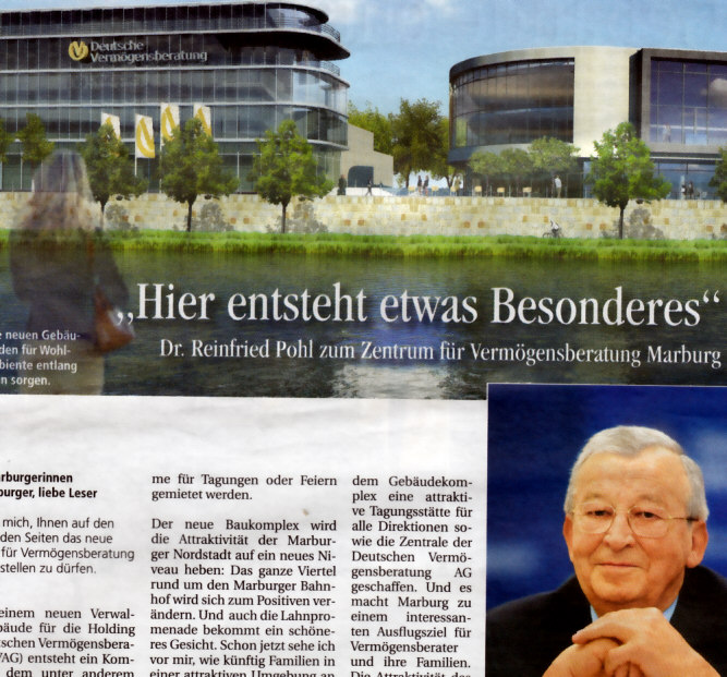 Kaum stand in der Oberhessischen Presse im März 2011 ein Artikel über das Richtfest des vom Marburger Ehrenbürger und DVAG Chef, Dr.Pohl, gestifteten Medizinstudenten-Ausbildungszentrums, lag der OP kurz darauf ein achtseitiges Werbeblatt der DVAG bei, mit dem erstmals, fast 15 Monate nach Baubeginn, die DVAG den Marburgern ihre neuen Paläste vorstellen will.