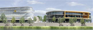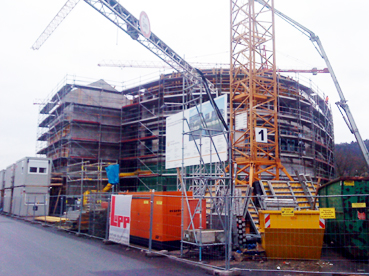 Auch in diesem Werbeblatt fehlen Ansichten , die die Gebäude in einem größeren Umfeld zeigen. Die Darstellungen zeigen stattdessen weitgehend vom Ambiente isolierte Bauten. Es ist nicht erkennbar, wie sie sich in das Bahnhofsviertel und die gesamte Stadtkulisse einfügen werden. Mitte Juni 2011 steht das Verwaltungsgebäude an der Bahnhofstraße im Rohbau und lässt ahnen: dieser Glaspalast wird sich architektonisch und städtebaulich an dieser Stelle wie ein Fremdkörper ausnehmen.